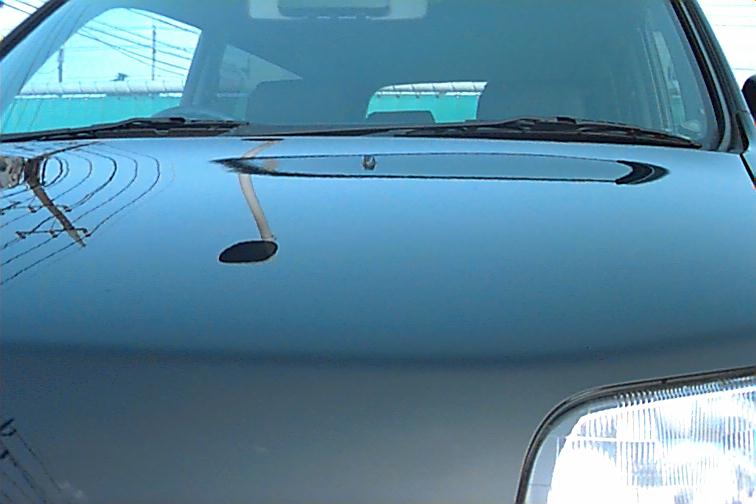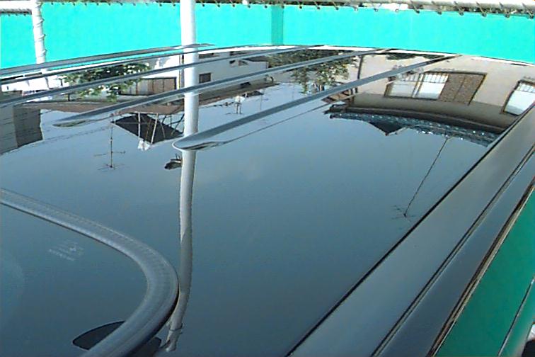 水洗い後、合成セームで拭き取りを行った直後の画像です。本ホームページ作成のためあえて一ヶ月以上水洗いだけで過ごしてきましたが、水を拭き取っただけでこの仕上がりです。これで、ワイピングクロスSを使用すればさらに良好な仕上がりになります。 あえて、これ以上施工する必要はないのですが、今回は写真撮影のため軽く一回塗りの施工を行うことにします。