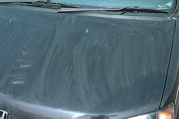 水で湿らせて固く絞ったスーパーワイピングクロスもしくは良質のネル布にポリラックを染み込ませて、薄く塗りたくります。かなりぞんざいに塗りたくっていますが、これで全くといっていいほどムラにならないのが凄いところです。(これがポリラックのポリラックたる所以でしょうその4) ボディーが汚れていれば、ここで布は真っ黒になります(彼女の車を施工したときに仰天)が、愛車S−MX号は新車時から使用しているので、汚れは殆どつきません。